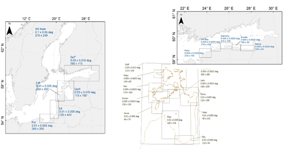 Three-level nested scheme of grids. The outer grid cover the Baltic Sea. Resolution on coastal grids of up to 250m.